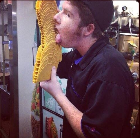4일 타코벨 공식 페이스북에 한 장의 사진이 올라왔다. 한 타코벨 직원이 자신의 손 위에 쌓아올린 타코를 혀로 핥는 사진을 직접 게재한 것이다.