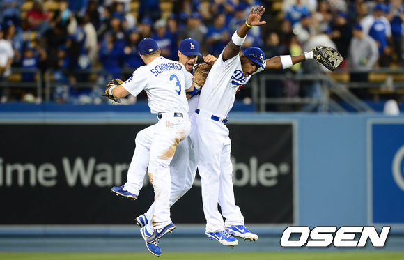 y5일 오전(이하 한국시간) 미국 캘리포니아주 로스앤젤레스 다저스타디움에서 열린 LA 다저스와 샌디에이고 파드리스의 경기 종료 후 슈마커, 이시어, 푸이그가 세리모니를 하며 승리를 기뻐하고 있다.