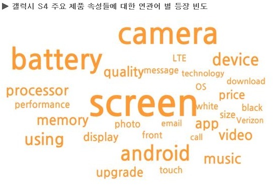 누리꾼들은 ‘갤럭시S4’의 주요 속성들 중에서 화면(screen), 카메라(camera), 배터리(battery)에 대해 가장 관심이 많았다. 이는 ‘갤럭시S3’의 경우도 마찬가지였으며 세 속성간 순위에 있어서만, ‘갤럭시S3’의 경우 카메라보다 배터리에 대한 관심이 더 높았다. ‘갤럭시S4’의 경우 1300만 화소의 카메라를 탑재하면서 카메라 기능을 크게 개선했기 때문으로 보인다.
