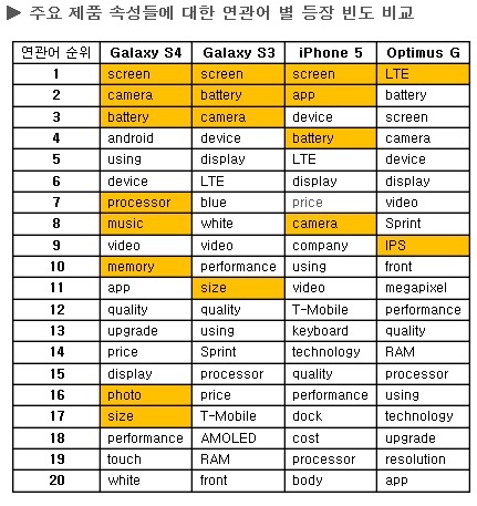 ‘갤럭시S4’에서 프로세서와 메모리가 많이 언급된 것은 쿼드코어 프로세서의 탑재와 출시 초기 OS와 기본 앱의 용량을 제외한 가용 메모리 부족 논란 때문으로 보인다. ‘옵티머스G’와 관련해서는 LTE 지원이 가장 많은 관심을 끌었고, LG 스마트폰의 디스플레이 구현 방식인 IPS가 많이 언급됐다. ‘아이폰5’와 관련해 특이한 점은 타 모델 대비 가격(price)에 대한 언급과 제조사(company) 언급이 많았다는 점이다.