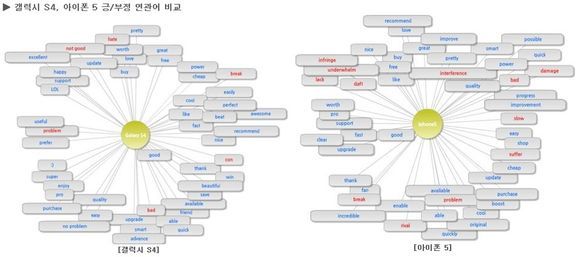 부정 어휘들은 problem(문제), bad(나쁘다) 등 표현이 공통적으로 가장 많았고, ‘아이폰5’의 경우 어리석은(daft), 실망시키다(underwhelm), 기능의 부족(lack) 등이 많았다. ‘갤럭시S4’는 증오하다(hate), 비싸다(expensive), 혼란스럽다(confuse), 지루하다(boring) 등 표현이 이어졌다.