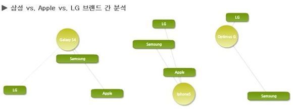 그러나 이는 ‘옵티머스G의 경우에는 예외인데, ‘옵티머스G’ 사용자들 또는 관심 소비자들은 상이한 OS를 사용하는 ‘Apple’을 언급하기 보다는 동일한 안드로이드OS의 갤럭시 시리즈 제조사 ‘Samsung’만을 검색했다.