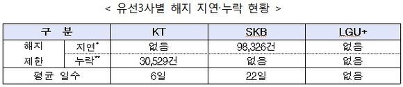 KT는 해지누락 사례가 총 해지건수의 10.4%(3만 529건), SK브로드밴드는 해지지연 사례가 67.0%(9만 8326건)에 해당되며 LGU+는 지연·누락 사례가 없는 것으로 확인됐다.
