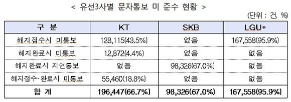 KT는 총 해지건수의 66.7%(19만 6447건), SK브로드밴드 67%(9만 8326건), LGU+ 95.9% (16만 7558건)를 준수하지 않은 것으로 조사됐다.