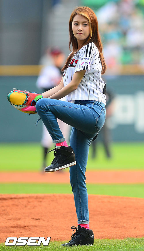5일 오후 서울 잠실구장에서 2013 한국야쿠르트 세븐프로야구 LG 트윈스와 두산 베어스의 경기가 열릴 예정인 가운데 경기 전 걸그룹 포미닛의 멤버 허가윤이 시구를, 권소현이 시타를 하고 있다.