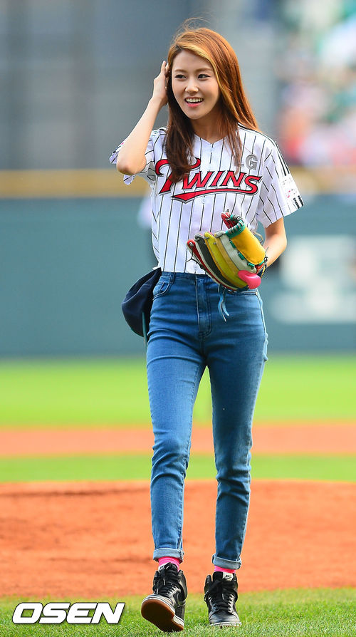 5일 오후 서울 잠실구장에서 2013 한국야쿠르트 세븐프로야구 LG 트윈스와 두산 베어스의 경기가 열릴 예정인 가운데 경기 전 걸그룹 포미닛의 멤버 허가윤이 시구를, 권소현이 시타를 하고 있다.