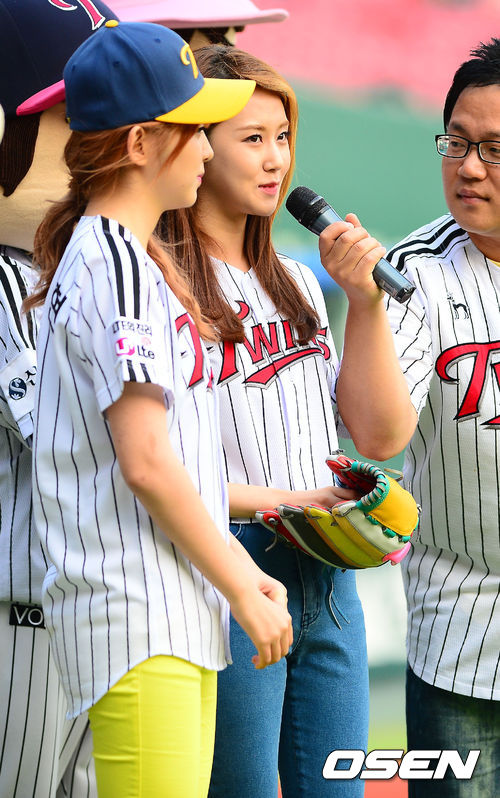 5일 오후 서울 잠실구장에서 2013 한국야쿠르트 세븐프로야구 LG 트윈스와 두산 베어스의 경기가 열릴 예정인 가운데 경기 전 걸그룹 포미닛의 멤버 허가윤이 시구를, 권소현이 시타를 하기 전 인터뷰를 하고 있다.