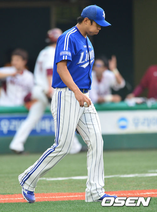 5일 오후 서울 목동구장에서 '2013 한국야쿠르트 세븐 프로야구' 넥센 히어로즈 대 삼성 라이온즈의 경기가 열렸다. 1회말 넥센 공격 무사 1, 3루 상황 3번 이택근에게 선제 1타점 중견수 희생플라이 를 허용하며 실점한 삼성 선발 윤성환이 아쉬운 표정을 짓고 있다.