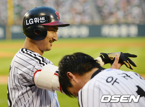 5일 오후 서울 잠실구장에서 열린 2013 한국야쿠르트 세븐프로야구 LG 트윈스와 두산 베어스의 경기에서 3회말 1사 주자 만루 박용택이 우월 만루 홈런을 날린 후 선발 우규민과 하이파이브를 하고 있다.