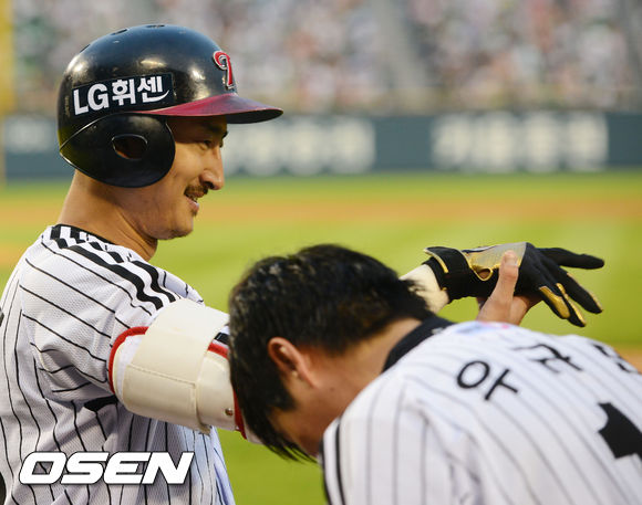5일 오후 서울 잠실구장에서 열린 2013 한국야쿠르트 세븐프로야구 LG 트윈스와 두산 베어스의 경기에서 3회말 1사 주자 만루 박용택이 우월 만루 홈런을 날린 후 덕아웃에서 우규민과 하이파이브를 하고 있다.