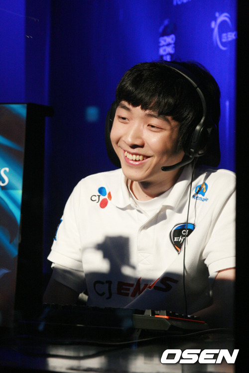 오랜만에 경기에 나서는 CJ 엔투스 프로스트 '뮤즈' 김범석이 1세트 시작 전 환하게 웃고 있다.