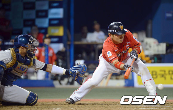 5일 오후 창원 마산구장에서 열린 '2013 한국야쿠르트 세븐 프로야구' NC 다이노스와 SK 와이번스 경기,5회초 무사1루 박경완 보내기번트를 성공시키고 있다.