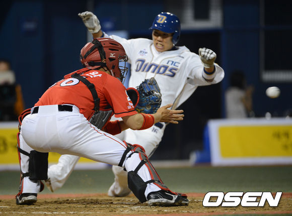 5일 오후 창원 마산구장에서 열린 '2013 한국야쿠르트 세븐 프로야구' NC 다이노스와 SK 와이번스 경기,5회말 무사 1,3루 나성범의 적시타때 1루주자 모창민 홈까지 쇄도하였으나 박경완 포수에게 태그아웃 처리되고 있다.