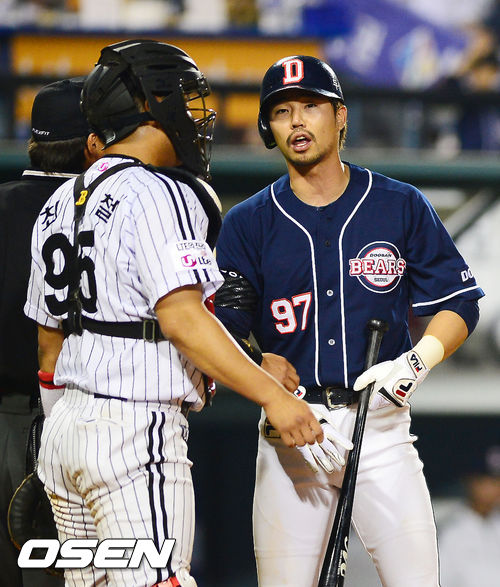 5일 오후 서울 잠실구장에서 열린 2013 한국야쿠르트 세븐프로야구 LG 트윈스와 두산 베어스의 경기에서 7회초 2사 주자 1,3루 두산 오재원이 타석에서 LG 최경철이 오재원이 자신의 사인을 봤다고 주장하며 오재원과 언쟁을 하고 있다.