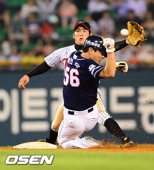 5일 오후 서울 잠실구장에서 열린 2013 한국야쿠르트 세븐프로야구 LG 트윈스와 두산 베어스의 경기에서 8회초 무사 주자 1루 두산 허경민 타석에서 1루 주자 박건우가 도루를 시도 LG 유격수 오지환이 볼을 놓치며 세이프되고 있다.