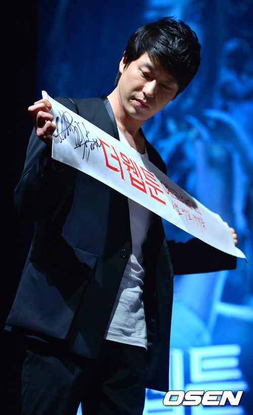 5일 오후 서울 합정동 메세나폴리스 인터파크 아트센터에서 진행된 영화 '더 웹툰:예고살인' 쇼케이스에서 배우 엄기준이 사인된 수건을 바라보고 있다.