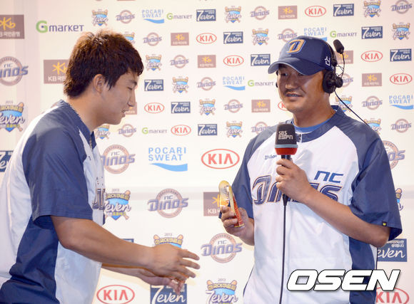 경기 종료후 선발 손민한이 방송인터뷰 도중 나성범으로 부터 홍삼드링크를 받고 있다./ ajyoung@osen.co.kr
