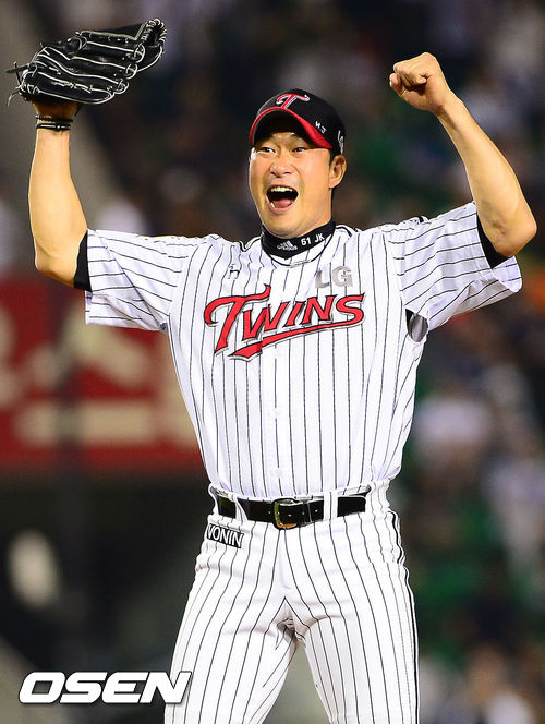 9회말 1사 주자 1루 두산 김현수의 타구를 유격수 병살타로 끝내며 LG 봉중근이 포효하고 있다./ rumi@osen.co.kr