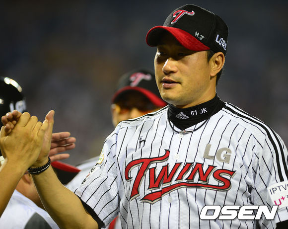 경기를 마치고 LG 봉중근이 코치진들과 하이파이브를 하고 있다. / rumi@osen.co.kr