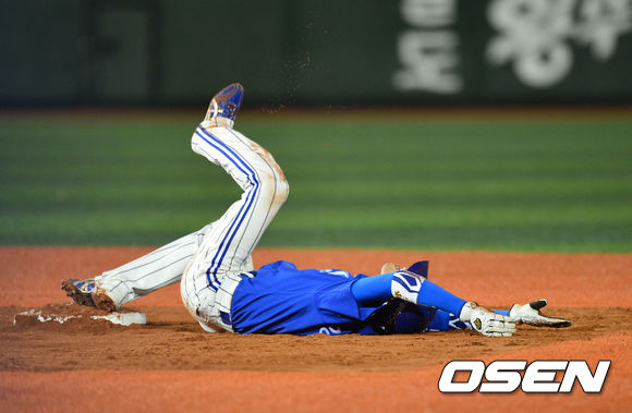 5일 오후 서울 목동구장에서 '2013 한국야쿠르트 세븐 프로야구' 넥센 히어로즈 대 삼성 라이온즈의 경기가 열렸다. 연장 12회초 삼성 공격 2사 1루 상황 5번 채태인 타석 때 2루 도루를 시도한 대주자 강명구가 태그에 걸려 아웃된 뒤 아쉬운 제스처를 취하고 있다.