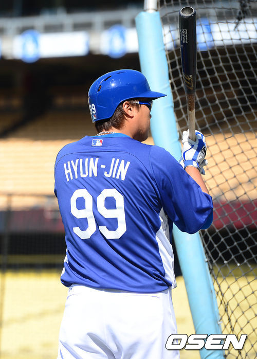 6일 오전(이하 한국시간) 미국 캘리포니아주 로스앤젤레스 다저스타디움에서 열리는 LA 다저스와 샌디에이고 파드리스의 경기 시작 전 류현진이 배팅훈련을 하고 있다. 성 RYU 대신 구단측의 실수로 이름 HYUN-JIN 이 새겨진 유니폼이 눈에 띈다.