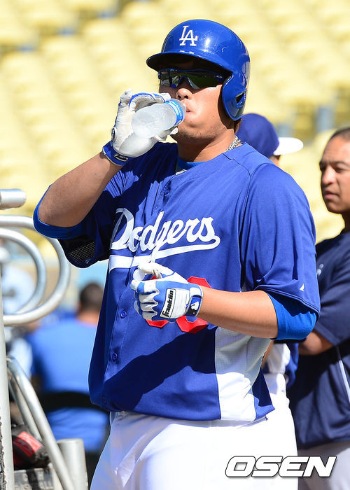 6일 오전(이하 한국시간) 미국 캘리포니아주 로스앤젤레스 다저스타디움에서 열리는 LA 다저스와 샌디에이고 파드리스의 경기 시작 전 류현진이 배팅훈련 중 음료를 마시고 있다.
