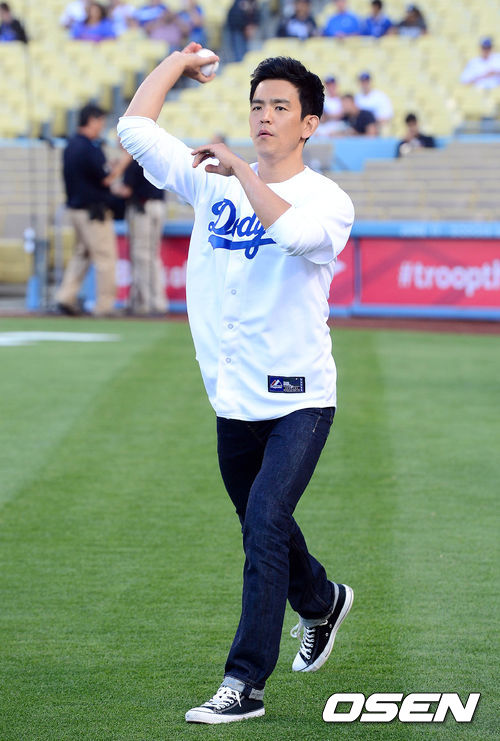 6일 오전(이하 한국시간) 미국 캘리포니아주 로스앤젤레스 다저스타디움에서 열리는 LA 다저스와 샌디에이고 파드리스의 경기 시작 전 배우 존 조가 시구 연습을 하고 있다.