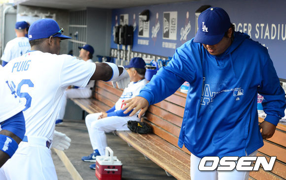 6일 오전(이하 한국시간) 미국 캘리포니아주 로스앤젤레스 다저스타디움에서 열린 LA 다저스와 샌디에이고 파드리스의 경기 시작 전 류현진이 푸이그와 세리모니를 하고 있다.