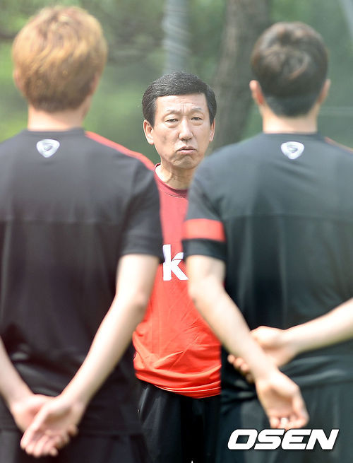 훈련에 앞서 최강희 감독이 선수들에게 이야기를 하고 있다.