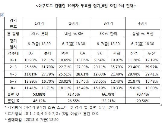 국민체육진흥공단(www.kspo.or.kr)이 발행하는 체육진흥투표권 수탁사업자인 스포츠토토 공식 온라인 발매 사이트인 베트맨(www.betman.co.kr)이 오는 7일(금) 오후 6시 30분부터 열리는 2013 국내프로야구(KBO) 4경기 8개 팀을 대상으로 한 야구토토 런앤런 10회차 투표율 중간집계 결과, 참가자들의 대다수인 73.45%는 넥센-KIA(2경기)전에서 홈런이 나올 것으로 예상했다고 밝혔다.