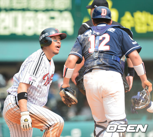 6일 오후 서울 잠실야구장에서 '2013 한국야쿠르트 세븐 프로야구' LG 트윈스 대 두산 베어스의 경기가 열렸다. 2회말 LG 공격 2사 1, 3루 상황 8번 최경철 타석 때, 이중도루를 시도한 3루 주자 이병규가 홈쇄도 했지만 두산 포수 최재훈의 태그에 걸려 아웃됐다. 최재훈의 상태를 묻는 이병규(왼쪽).