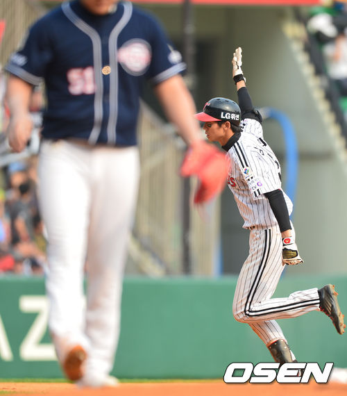6일 오후 서울 잠실야구장에서 '2013 한국야쿠르트 세븐 프로야구' LG 트윈스 대 두산 베어스의 경기가 열렸다. 8회말 LG 공격 1사 주자없는 상황 2번 김용의가 우월 역전 솔로포를 날리고 환호하며 그라운드를 돌고 있다.