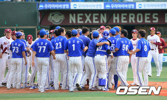 6일 오후 서울 목동구장에서 열린 '2013 한국야쿠르트 세븐 프로야구' 넥센 히어로즈와 삼성 라이온즈의 경기 7회말 1사 1루 넥센 이택근의 몸에 맞는 공에 양팀 선수들이 충돌하고 있다