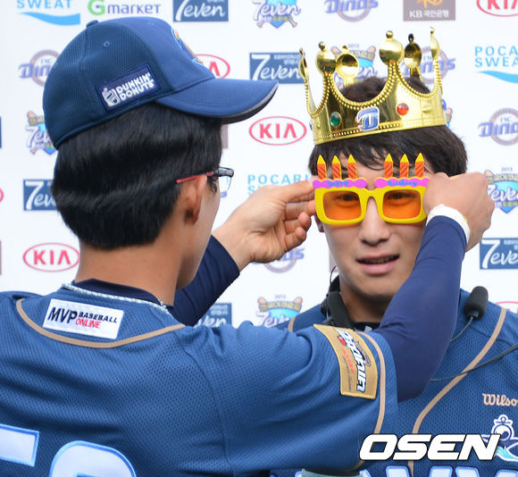경기 종료후 NC 나성범이 방송인터뷰중 왕관 세리머니를 펼치며 방송에 임하고 있다./ ajyoung@osen.co.kr