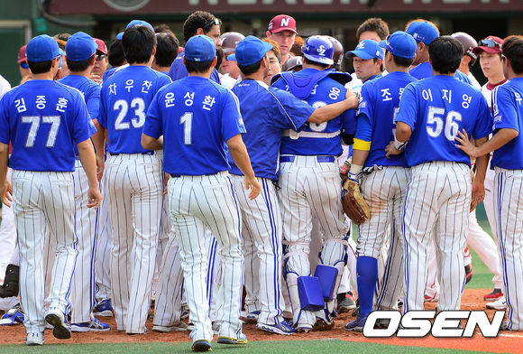 6일 오후 서울 목동구장에서 열린 '2013 한국야쿠르트 세븐 프로야구' 넥센 히어로즈와 삼성 라이온즈의 경기 7회말 1사 1루 삼성 심창민 투수의 투구에 맞은 넥센 이택근이 격한 감정으로 마운드로 달려나갔다. 이후 이택근과 진갑용이 충돌하면서 벤치클리어링 상황이 벌어지고 있다.