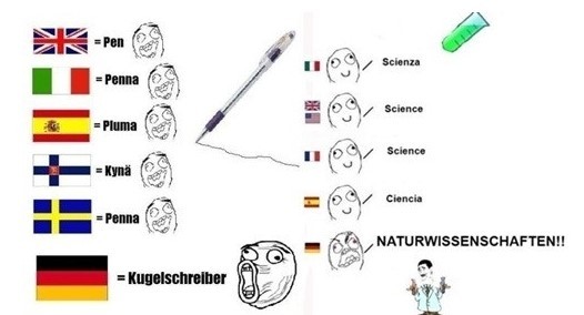 특히 독일어는 이들중 가장 복잡하게 나타나며 '독일어의 위엄'을 증명했다. 이를테면 볼펜의 경우 영어로 'pen', 이탈리아어로 'penna', 스페인어로 'pluma', 스웨덴어로 'penna' 이지만 독일어는 'Kugelschreiber'라는 긴 단어를 사용한다.