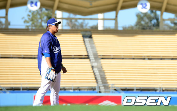 7일 오전(이하 한국시간) 미국 캘리포니아주 로스앤젤레스 다저스타디움에서 열리는 LA 다저스와 애틀랜타 브레이브스의 경기 시작 전 류현진이 훈련을 하고 있다.
