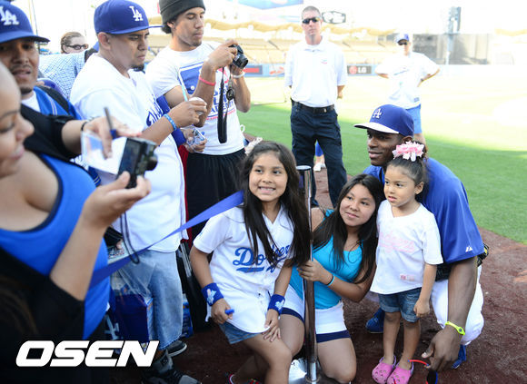 7일 오전(이하 한국시간) 미국 캘리포니아주 로스앤젤레스 다저스타디움에서 열리는 LA 다저스와 애틀랜타 브레이브스의 경기 시작 전 푸이그가 팬들과 사진을 찍고 있다.