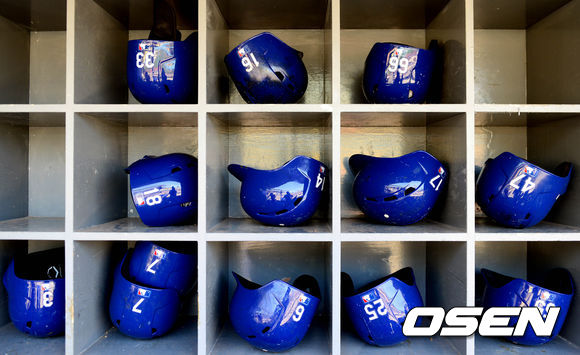 다저스 덕아웃에 놓인 헬멧