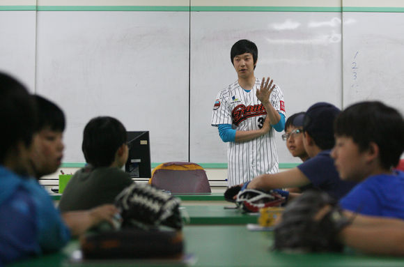 롯데 자이언츠 우완 김수완이 7일 부산 남천초등학교를 찾아 학생들의 진로 체험 학습을 위한 강연을 실시했다.