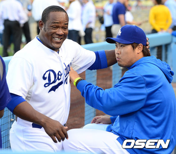 7일 오전(이하 한국시간) 미국 캘리포니아주 로스앤젤레스 다저스타디움에서 열리는 LA 다저스와 애틀랜타 브레이브스의 경기 시작 전 우리베와 류현진이 장난을 치고 있다.