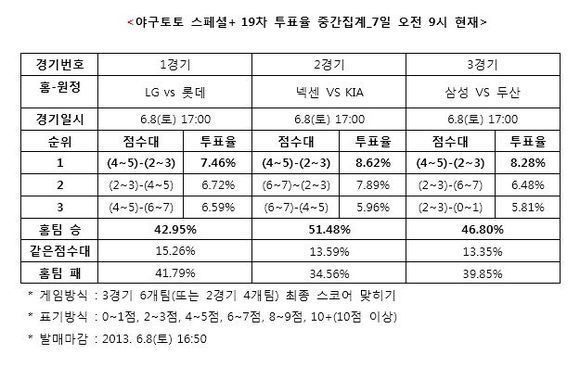 국내프로야구(KBO) 주말 3경기 대상 야구토토 스페셜+ 19회차 투표율 중간집계