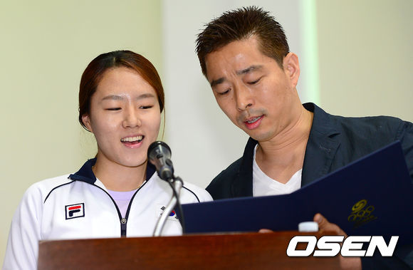 7일 오전 태릉선수촌 챔피언하우스에서 열린 동계종목 체육인의 염원과 각오를 담은 '2014 소치 및 2018 평창동계올림픽대회 성공다짐대회'에서 스피드 이상화와 아이스슬레지 한민수가 성공개최 다짐 결의문을 낭독 하고 있다.
