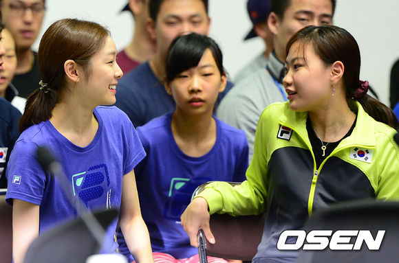 7일 오전 태릉선수촌 챔피언하우스에서 열린 동계종목 체육인의 염원과 각오를 담은 '2014 소치 및 2018 평창동계올림픽대회 성공다짐대회'에서 피겨 김연아와 김해진이 이야기를 나누고 있다.