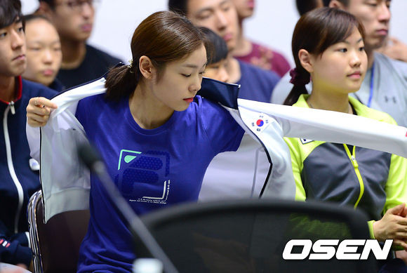 7일 오전 태릉선수촌 챔피언하우스에서 열린 동계종목 체육인의 염원과 각오를 담은 '2014 소치 및 2018 평창동계올림픽대회 성공다짐대회'에서 피겨 김연아가 국가대표 재킷을 입고 있다.