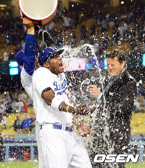 7일 오전(이하 한국시간) 미국 캘리포니아주 로스앤젤레스 다저스타디움에서 열린 LA 다저스와 애틀랜타 브레이브스의 경기 종료 후 푸이그가 인터뷰 도중 크루스에게 물세례를 당하고 있다.