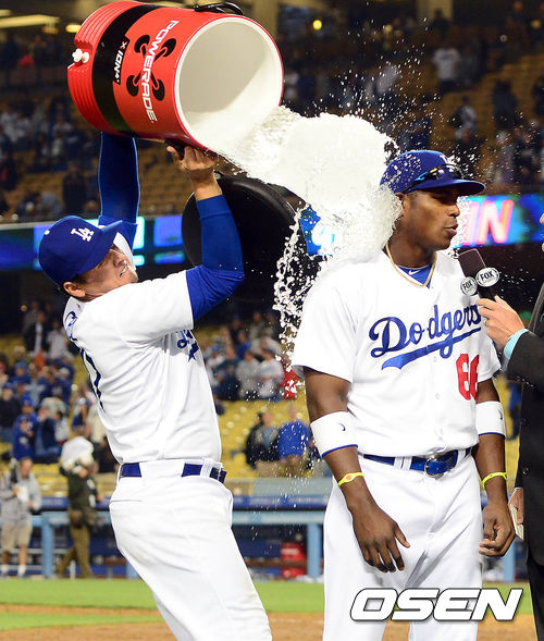 7일 오전(이하 한국시간) 미국 캘리포니아주 로스앤젤레스 다저스타디움에서 열린 LA 다저스와 애틀랜타 브레이브스의 경기 종료 후 푸이그가 인터뷰 도중 크루스에게 물세례를 당하고 있다.