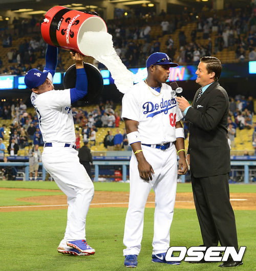 7일 오전(이하 한국시간) 미국 캘리포니아주 로스앤젤레스 다저스타디움에서 열린 LA 다저스와 애틀랜타 브레이브스의 경기 종료 후 푸이그가 인터뷰 도중 크루스에게 물세례를 당하고 있다.