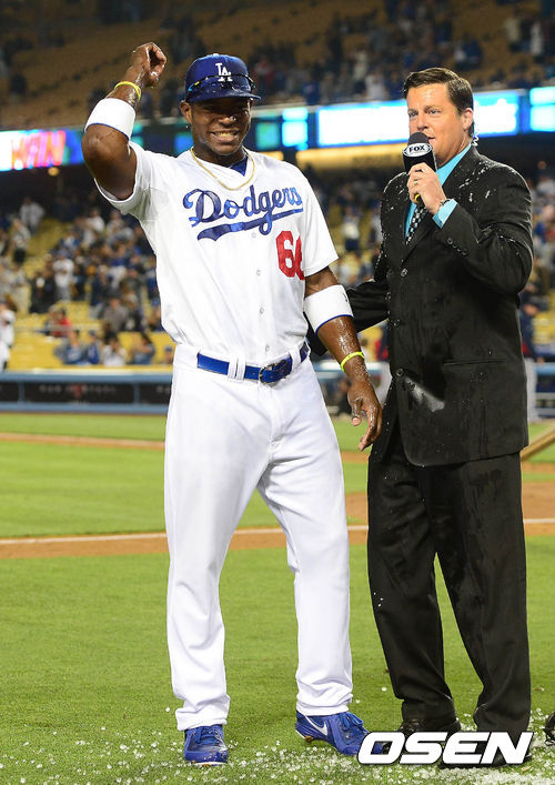 7일 오전(이하 한국시간) 미국 캘리포니아주 로스앤젤레스 다저스타디움에서 열린 LA 다저스와 애틀랜타 브레이브스의 경기 종료 후 푸이그가 인터뷰를 하고 있다.