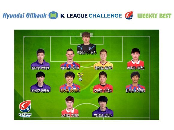 미드필더 부문은 정교한 크로스와 킥력을 장착하고 공격의 엔진 역할을 완수하며 1골을 넣은 김한원(수원), 적극적인 침투와 과감한 슈팅으로 종료 직전 결승골을 터뜨린 주민규(고양), 저돌적인 돌파와 왕성한 활동량으로 상대 측면 수비를 무너뜨리며 1도움을 기록한 조성준(안양)이 유수현과 함께 어깨를 나란히 했다.